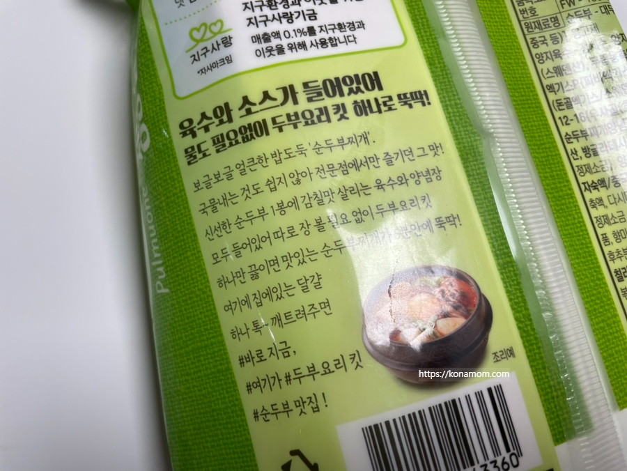 저는 순두부찌개를 참 좋아하는데, 집에서 끓이려면 국물 맞추기가 힘들어서 김치찌개만큼 편하게 끓여서 먹지는 못합니다. 그런데 풀무원에서 나온 순두부찌개 KIT가 있어서 마켓컬리에서 구입해 봤어요.