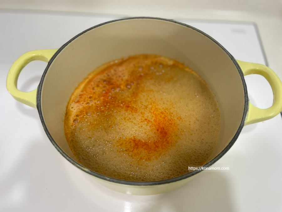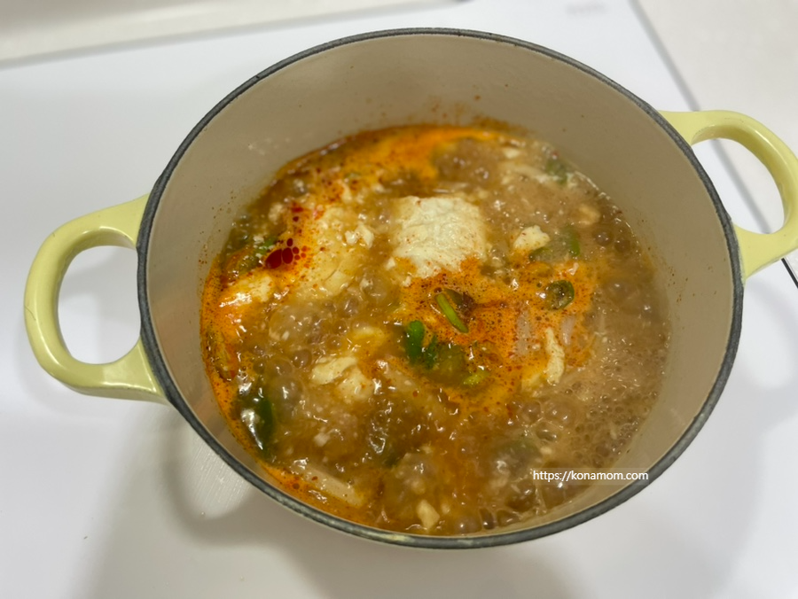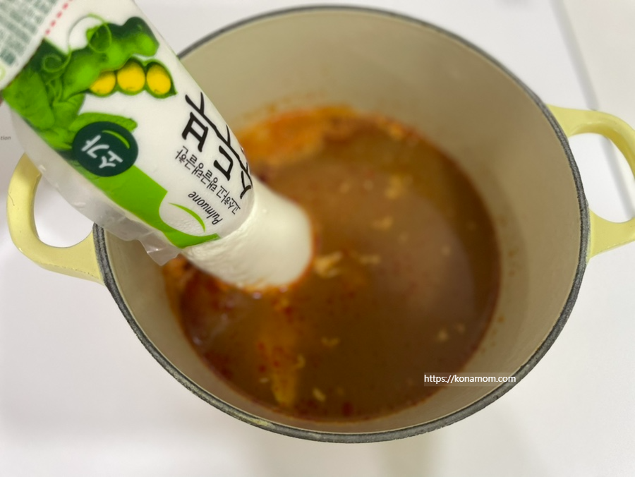 냄비에 육수와 양념장을 넣고 팔팔 끓인 후 순두부를 넣고 3분만 끓여주면 돼요.