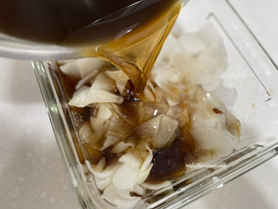 3. 육수를 붓고, 취향에 따라 겨자소스를 넣어 드시면 돼요.(육수는 냉동실에 미리 얼려뒀다가 드시면 좋습니다.)