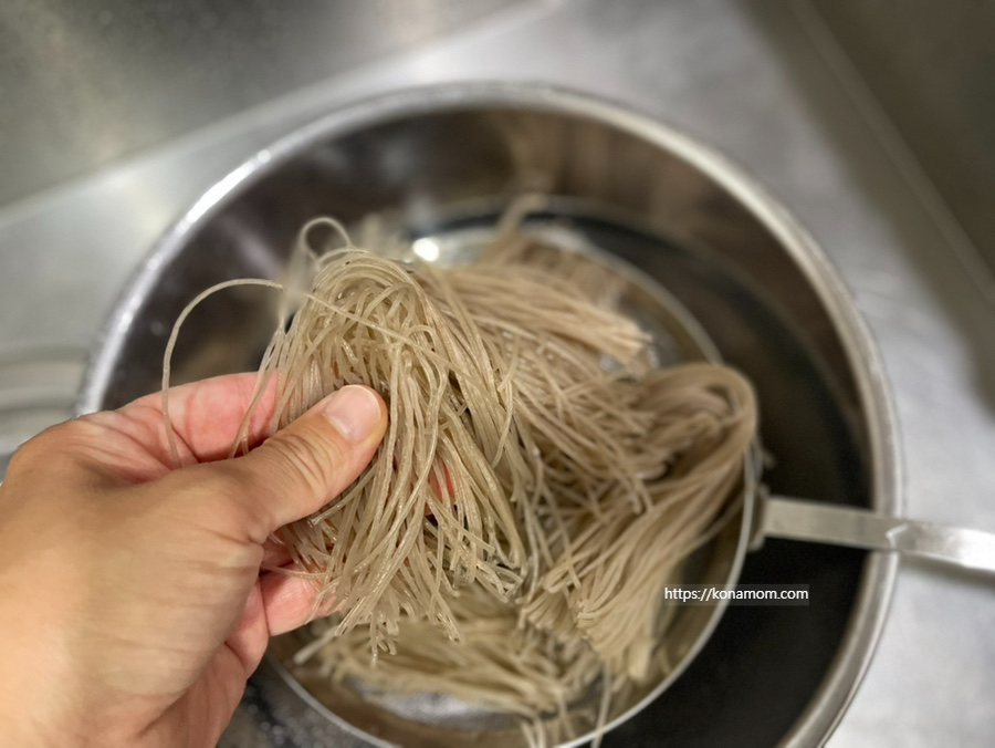 2. 면을 건져내어 흐르는 찬물에서 끈적임이 없어질 때까지 충분히 헹군 후 물기를 완전히 빼서 그릇에 담습니다.
