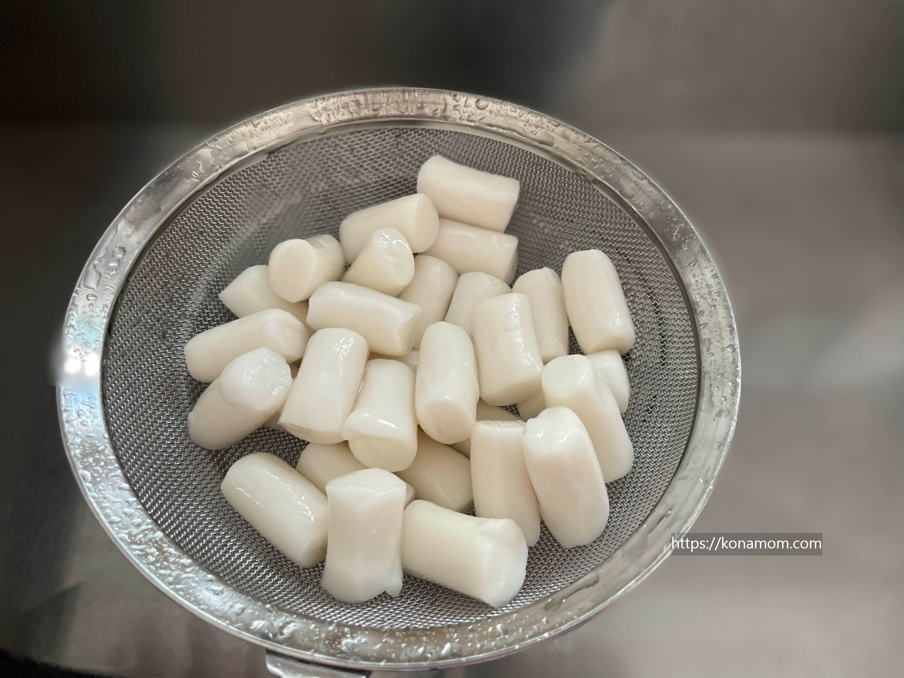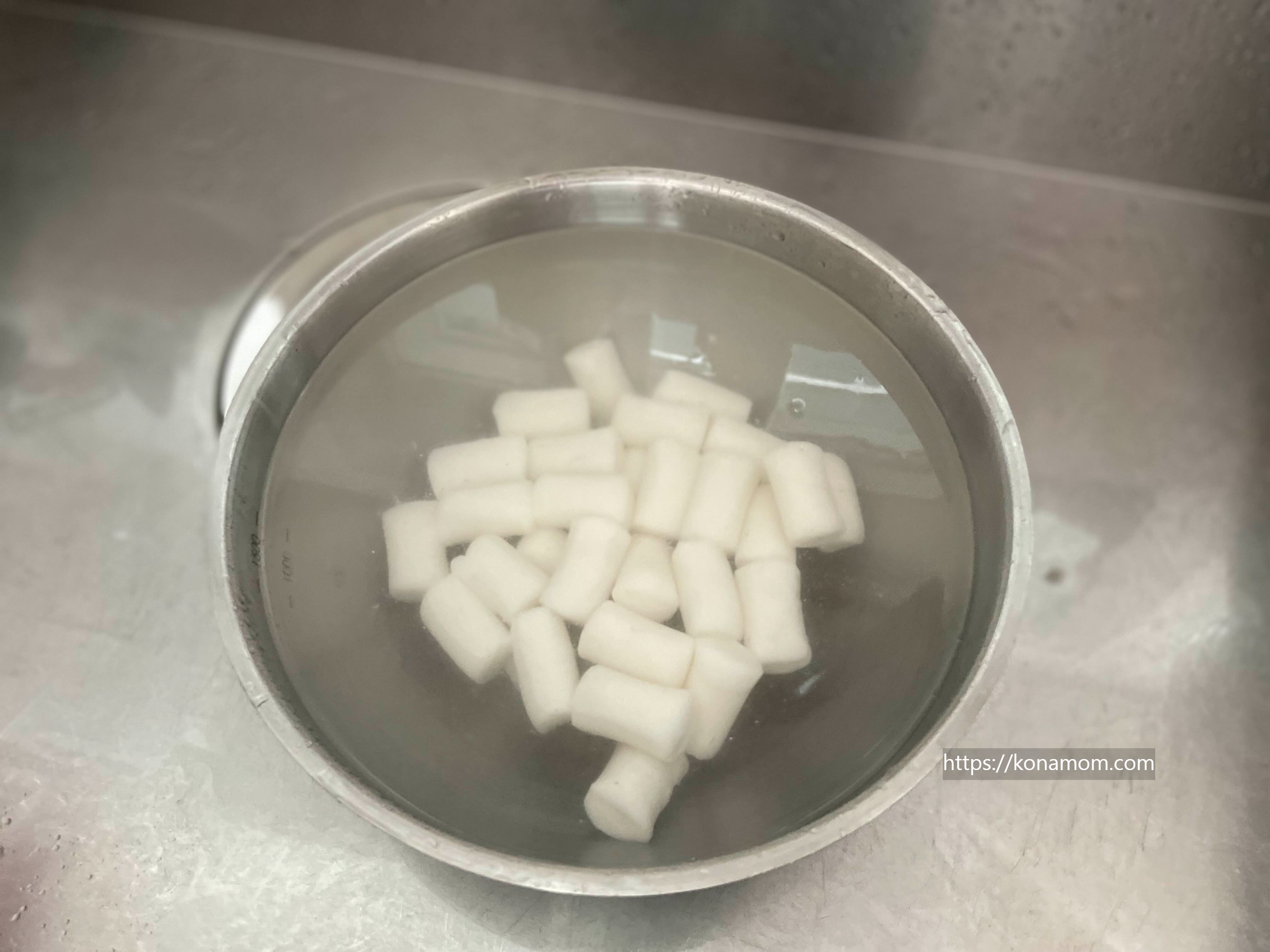 쌀떡은 찬물에 10분 정도 담근  뒤 한번 헹궈 줍니다.