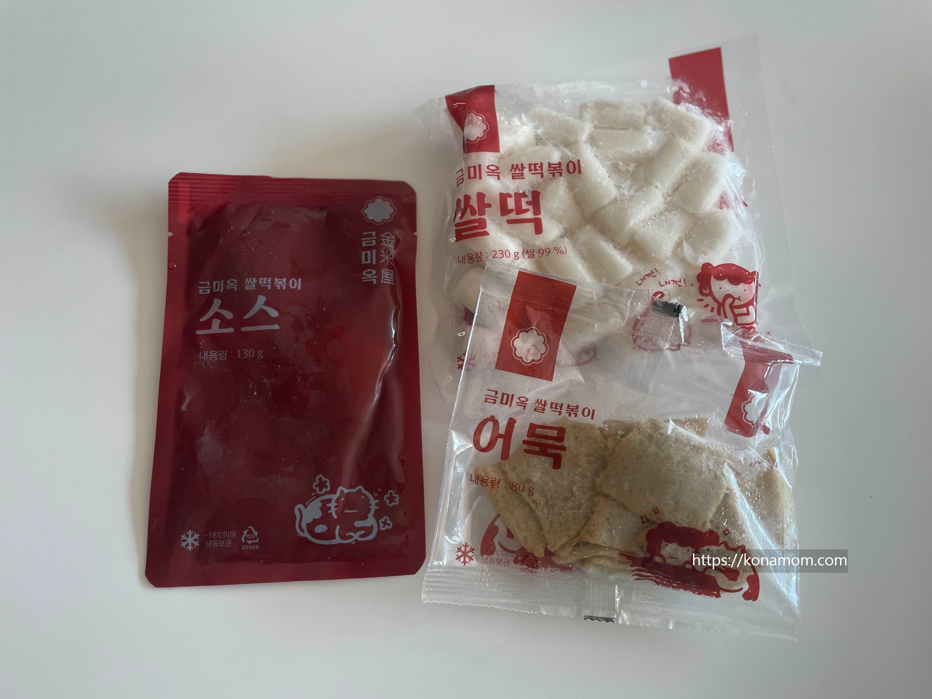 구성은 금미옥 떡볶이 소스, 쌀떡, 어묵 이렇게 세 가지가 들어가 있어요.