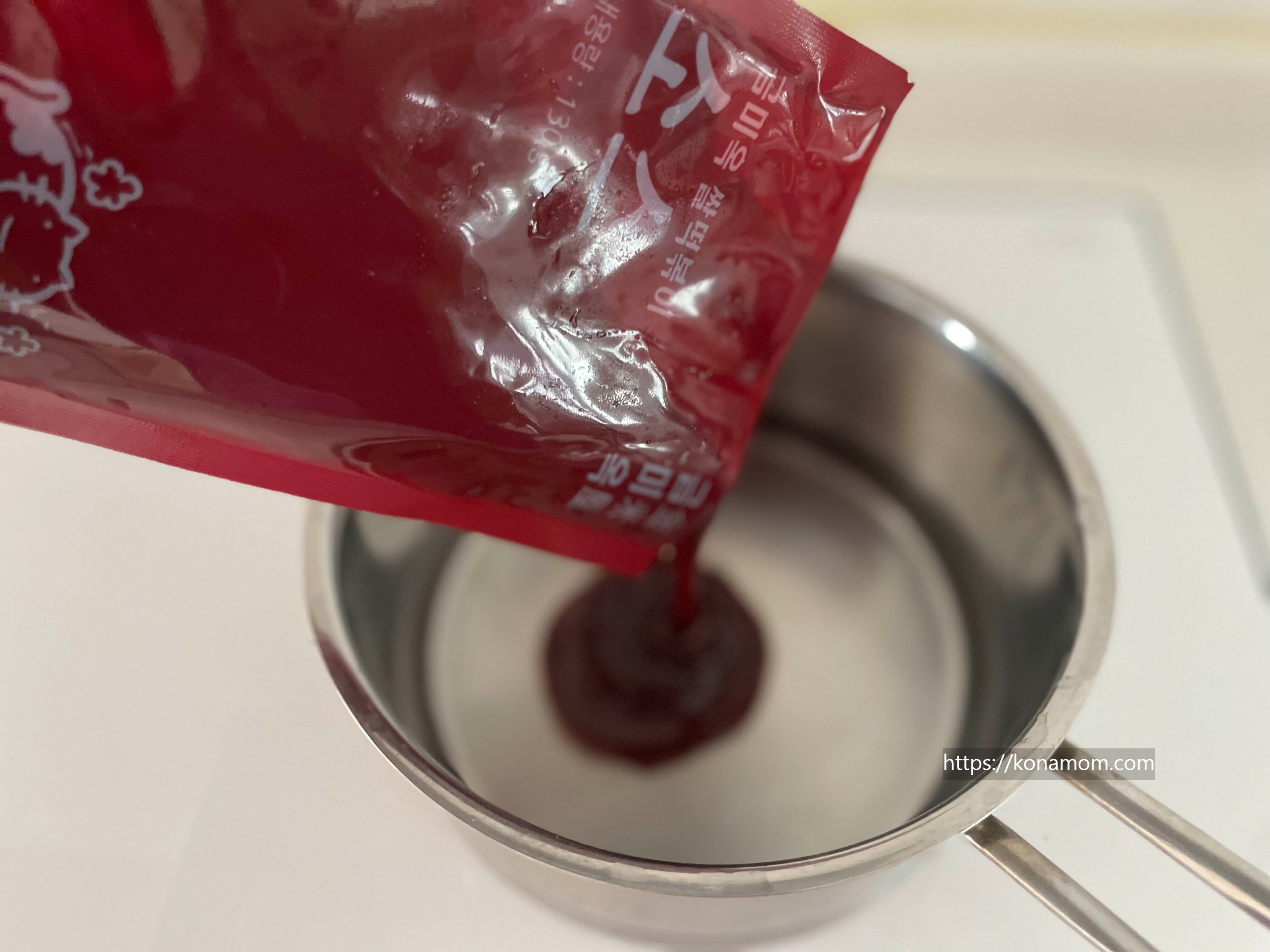 냄비에 물 350ml 붓고 소스 넣어서 소스가 잘 풀어지도록 저어 줍니다.