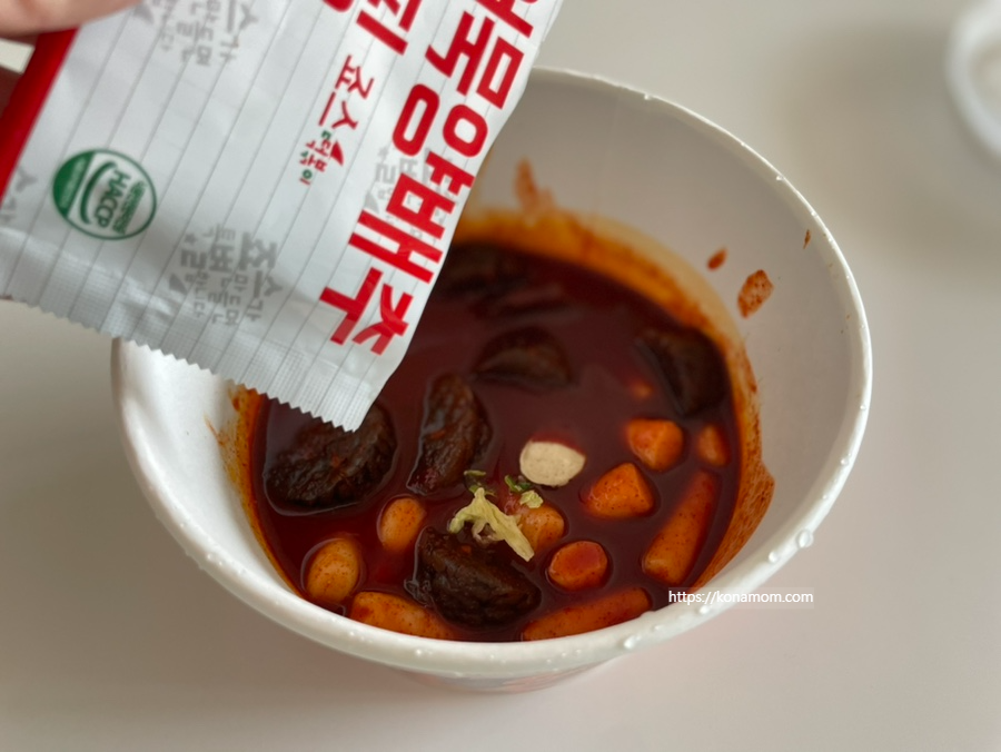 조리법 대로 하면 이렇게 토핑을 나중에 넣는데, 그럼 토핑이 좀 딱딱해서 평소에는 처음 종이컵에 떡, 떡볶이소스, 순대를 넣을 때 같이 넣고 전자레인지에 돌려서 먹습니다.