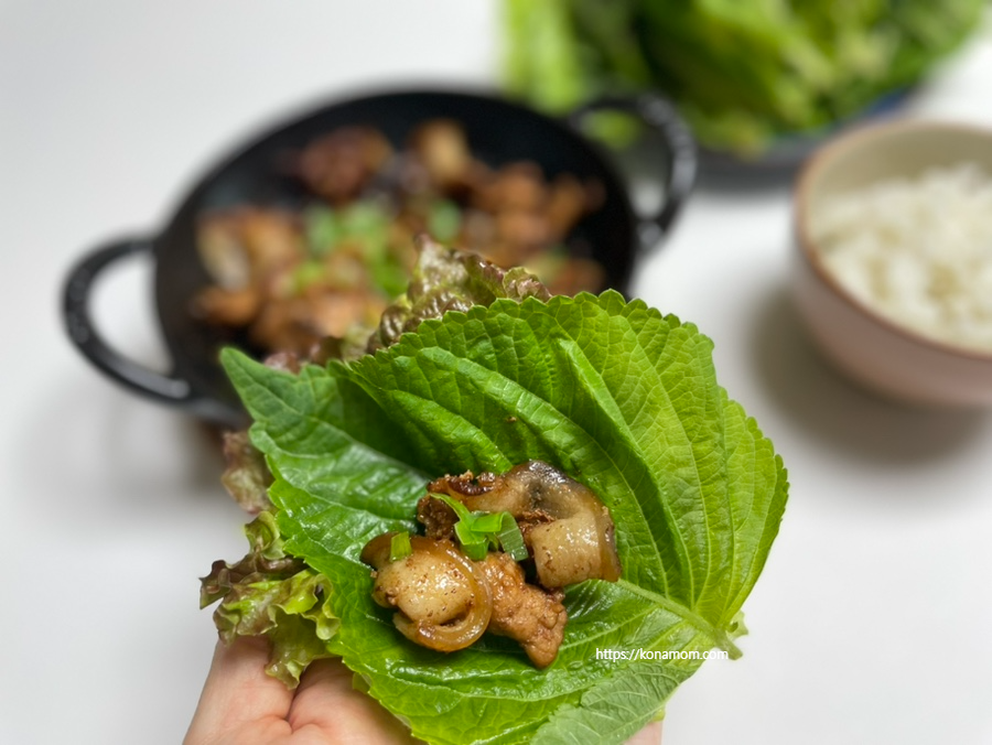 부추무침이랑 쌈무로 만든 무생채 레시피도 같이 나왔었는데, 주말농장에서 수확한 쌈채소가 있어서 기사식당느낌 돼지불백만 조리해서 먹었습니다.