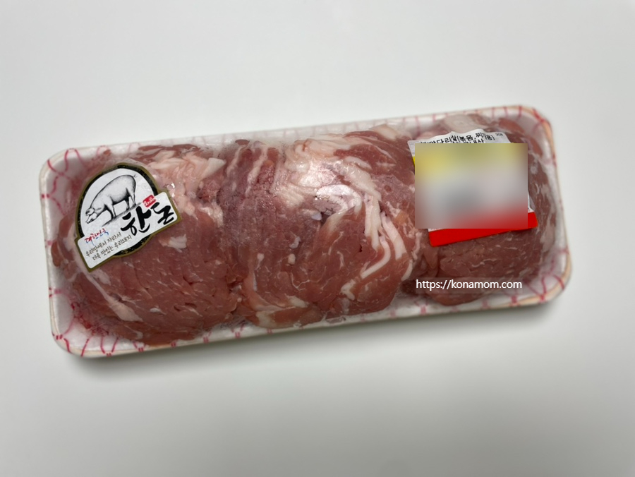 돼지고기는 지방이 있는 앞다리살로 준비했어요. 너무 저렴한 것보다는 한 근(600g)에 8,000원 정도는 하는 것으로 구입하는 게 좋다고 류수영 님이 방송에서 얘기하셨습니다.