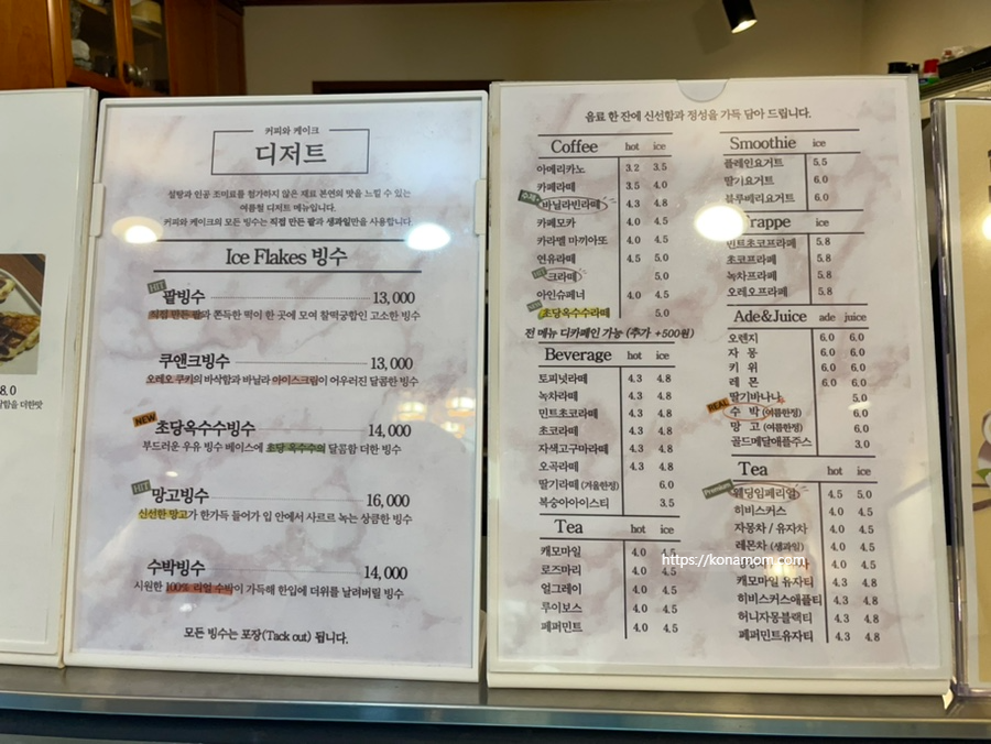 메뉴는 디저트와 커피, 음료 빙수 등 다양하게 있습니다.