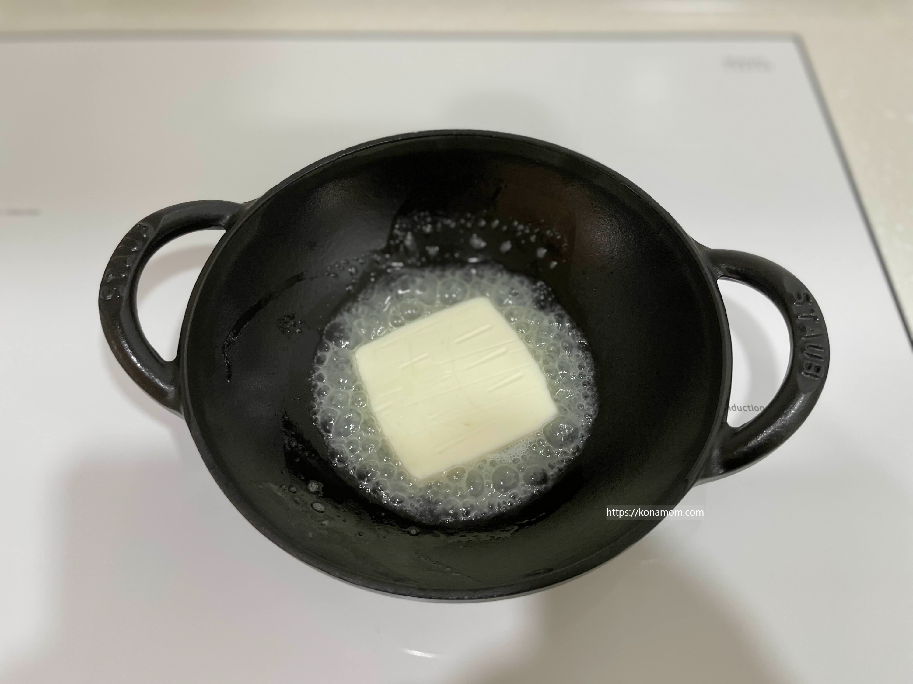 중불로 가열된 팬에 버터 조각을 넣어서 녹여줍니다.(버터는 부족한 것보다는 넉넉하게 넣어 주세요.)