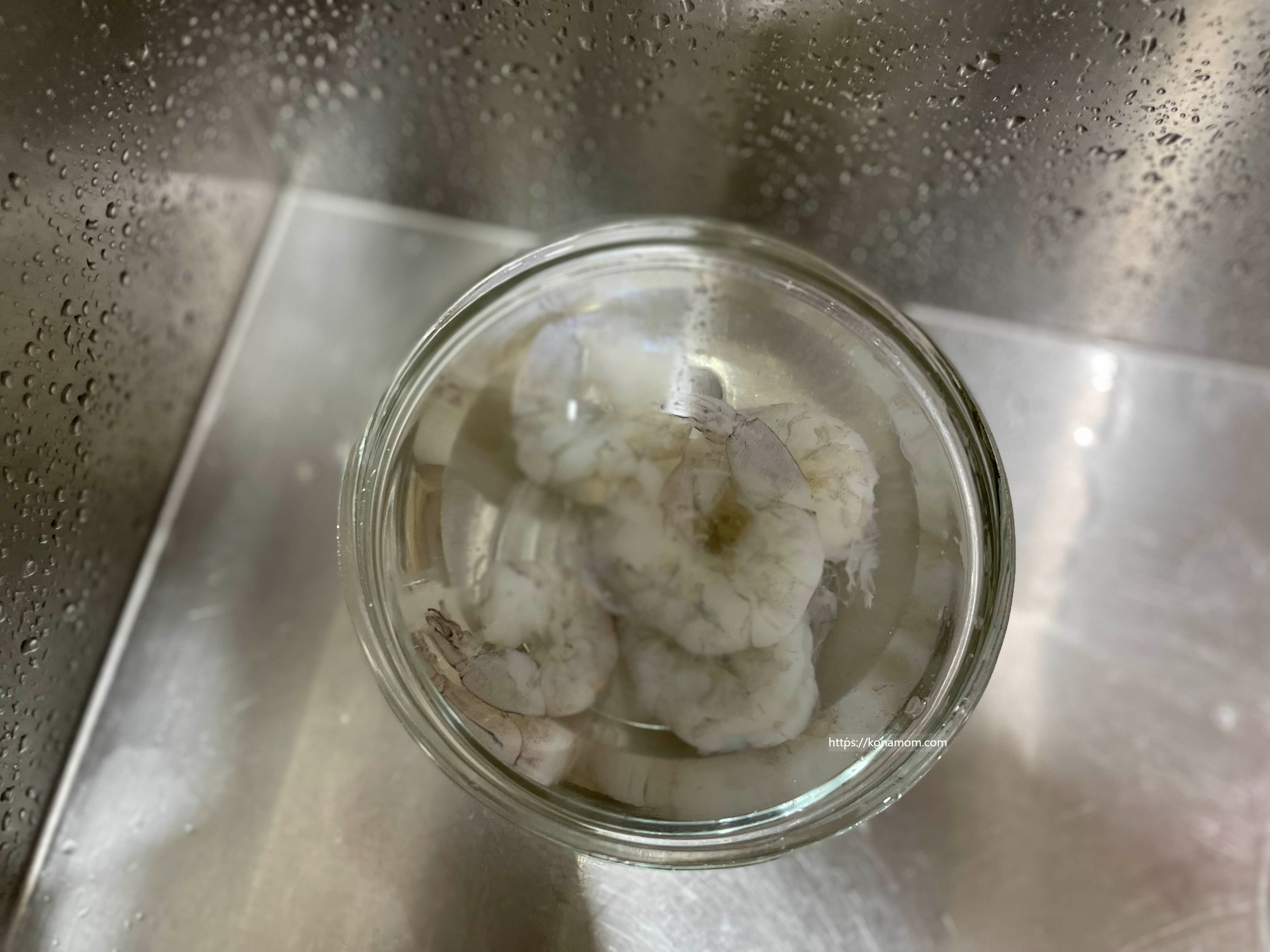 해동된 새우는 깨끗하게 씻어서 이쑤시개로 내장을 제거해 줍니다.