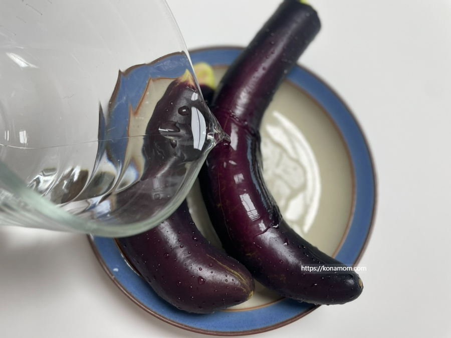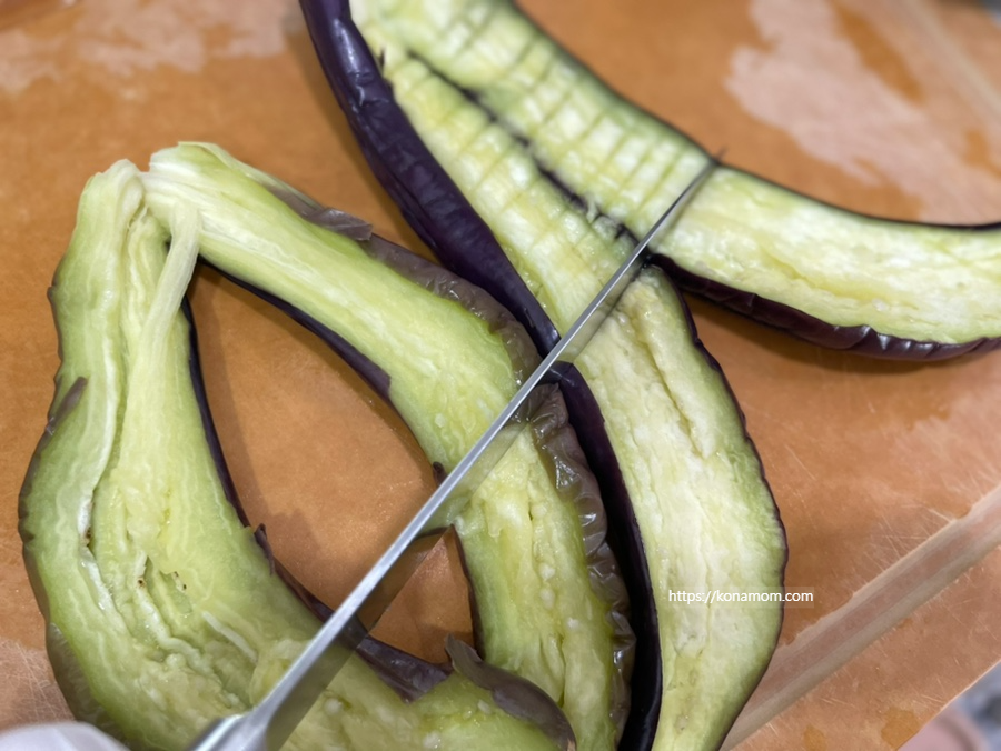 레인지에서 꺼낸 가지는 반으로 잘라서 칼모양을 내어 줍니다.(엄청 뜨거우니 조심하셔야 해요.)