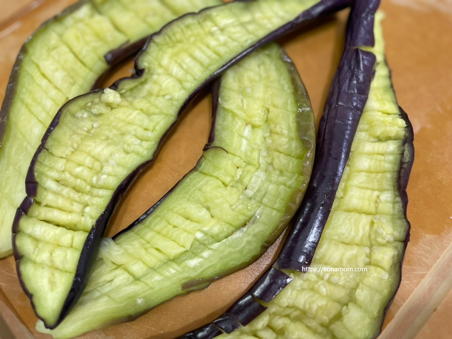 레인지에서 꺼낸 가지는 반으로 잘라서 칼모양을 내어 줍니다.(엄청 뜨거우니 조심하셔야 해요.)