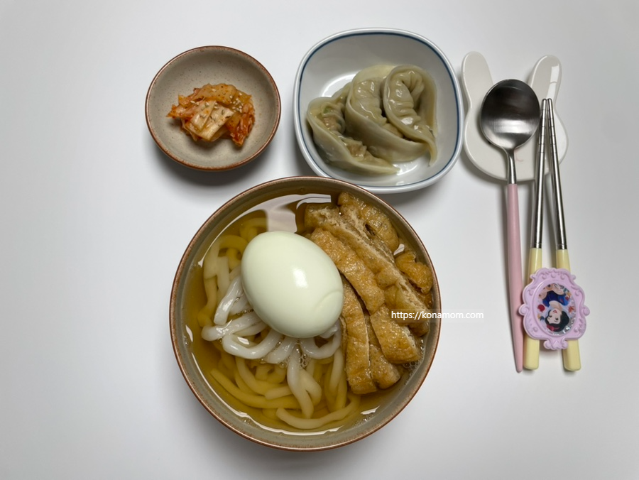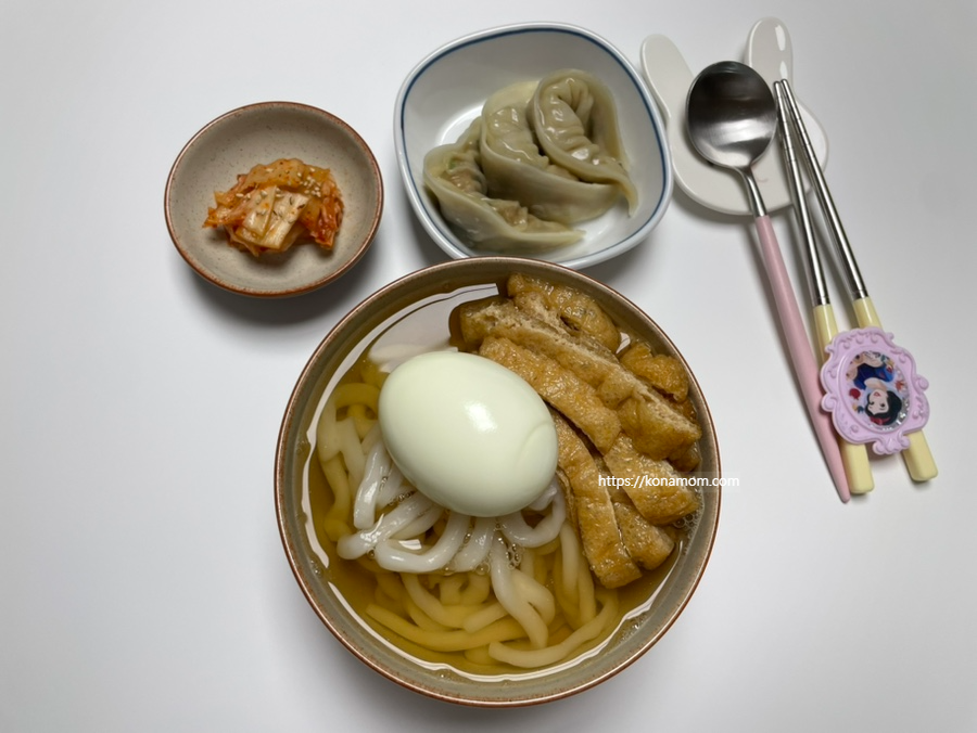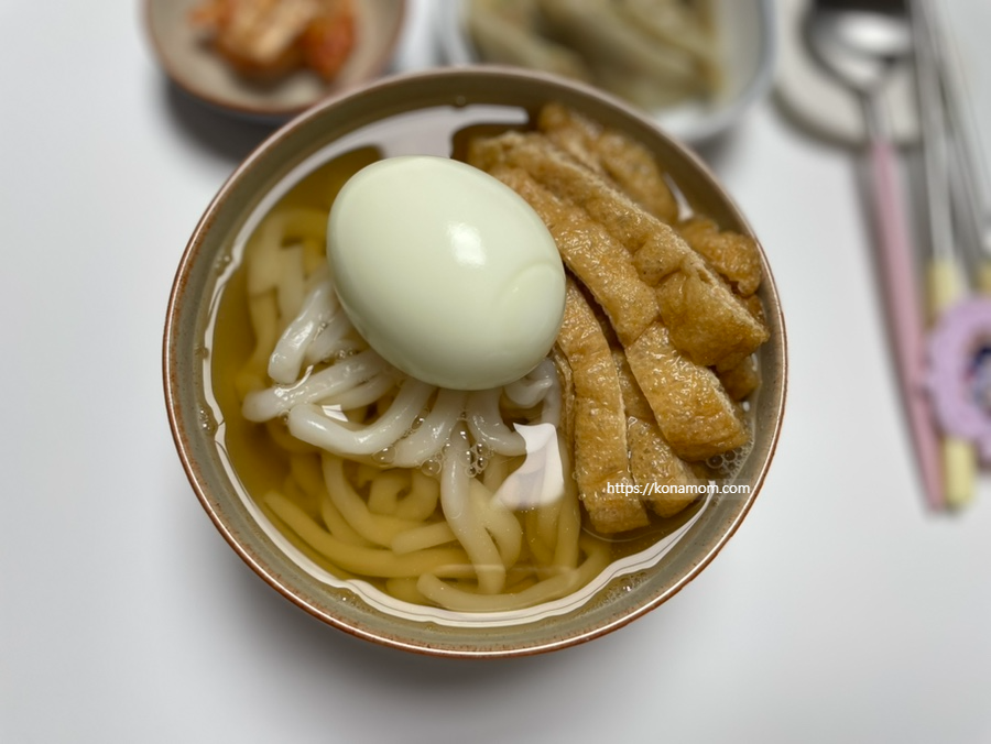 우동만 먹으면 단백질이 아쉬워 삶은 달걀을 하나씩 올려서 같이 먹는데, 잘 어울립니다.