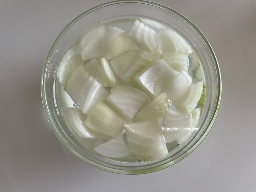 양파는 식초 한 스푼 희석한 물에 10분 정도 담아둡니다.