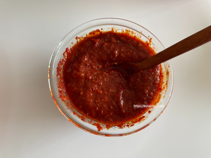 고추장 2큰술, 고춧가루 2스푼, 진간장 1스푼, 식초 5스푼, 참기름 1스푼, 다진 마늘 1큰술, 통깨 조금 넣고 섞어 주시면 됩니다.