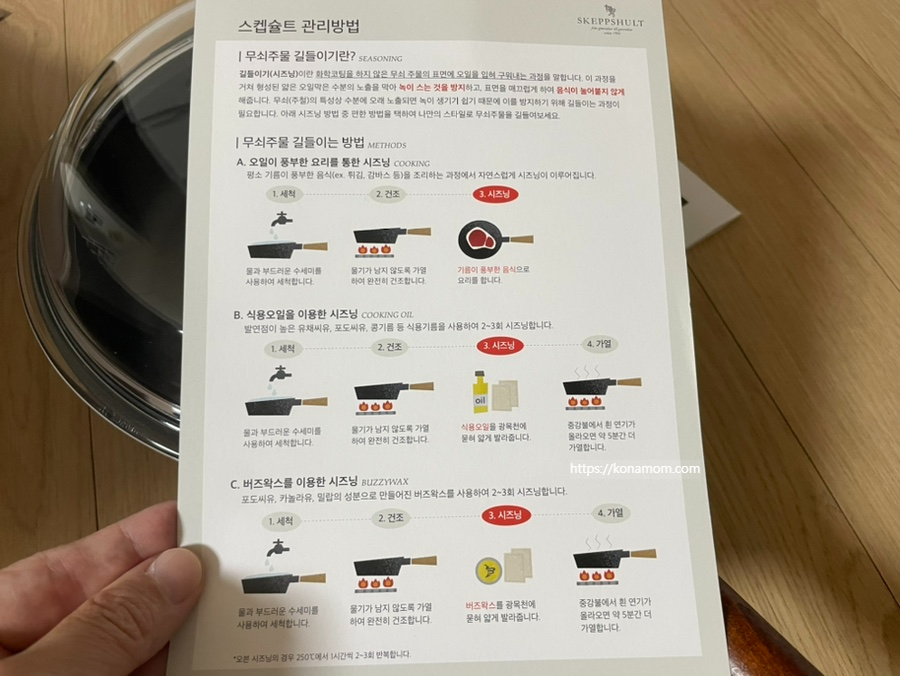 무쇠프라이팬 길들이는 법은 스켑슐트 구입 시 들어가 있는 안내서를 참고하시면 될 것 같습니다.