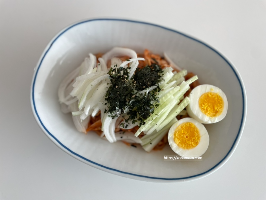 저는 비빌 때는 양배추만 넣었고 나중에 고명으로 양파, 오이, 삶은 달걀을 올렸는데요,