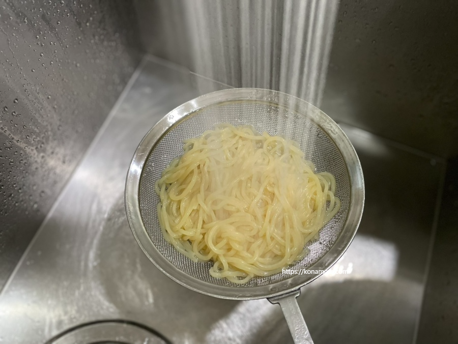 면을 건져내어 끈적임이 없어질 때까지 찬물에 헹군 후, 물기를 완전히 제거하여 그릇에 담아 주세요.