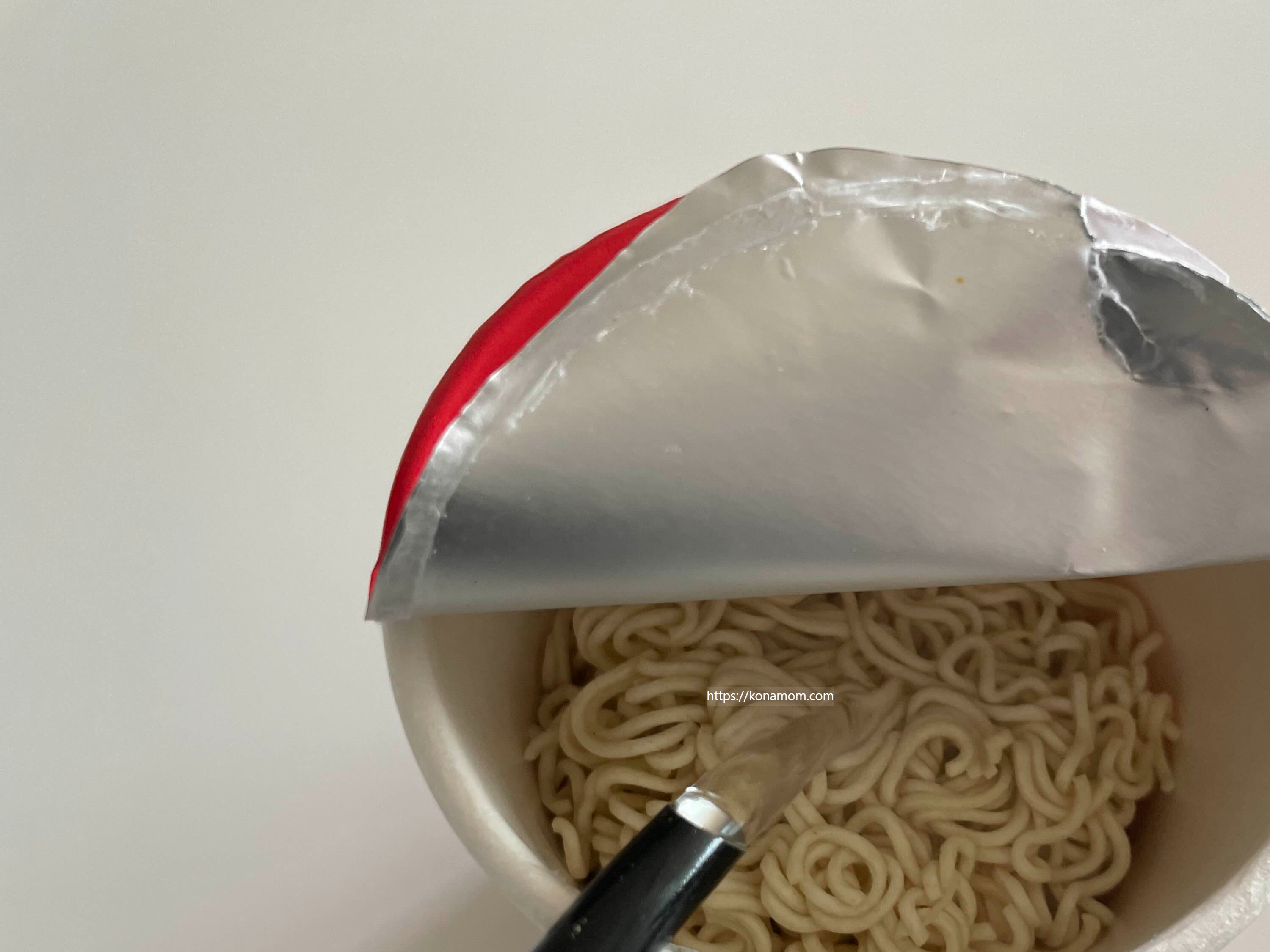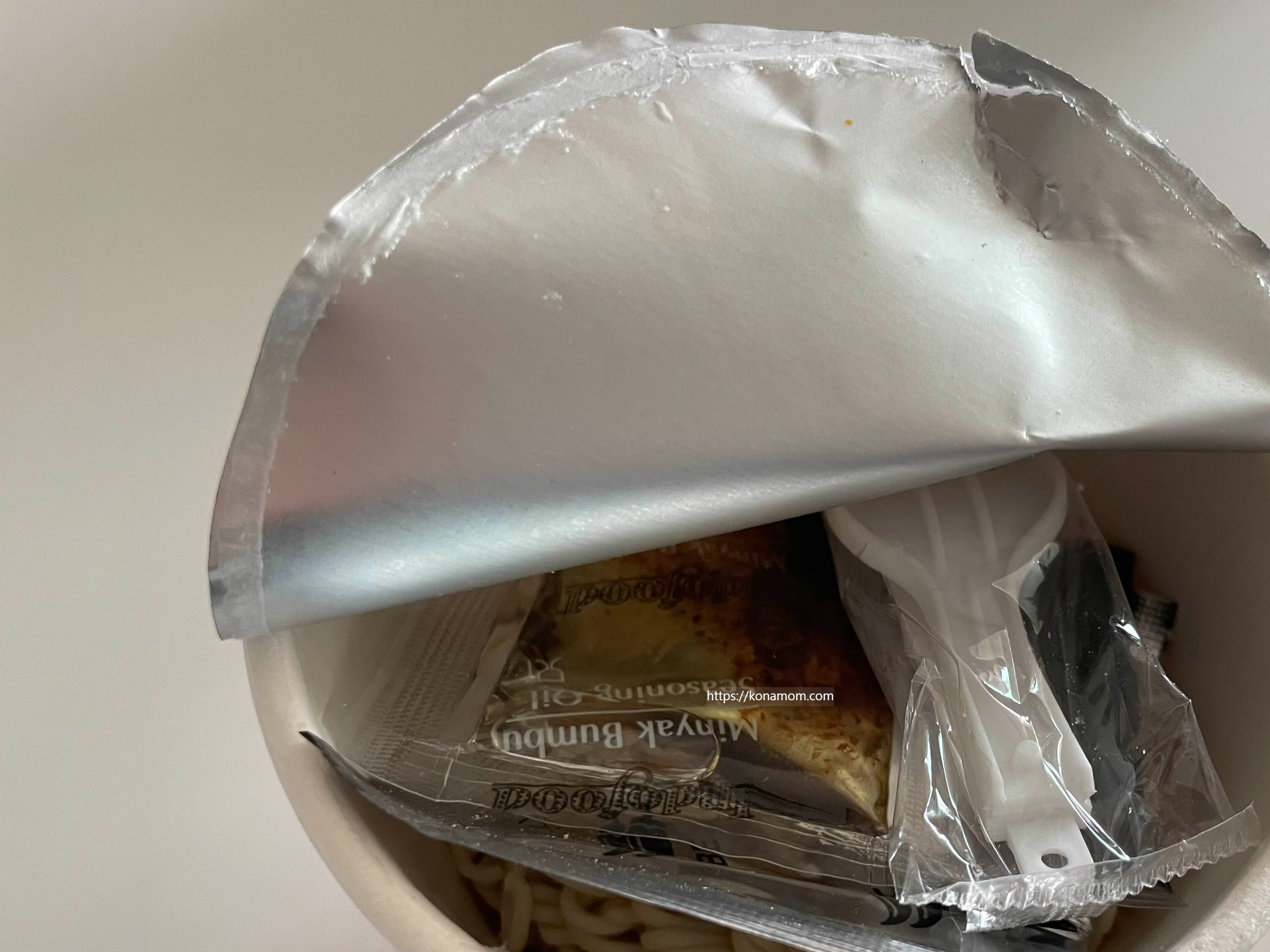 컵라면을 표시선까지 뜯어서 안에 소스와 포크를 빼고
