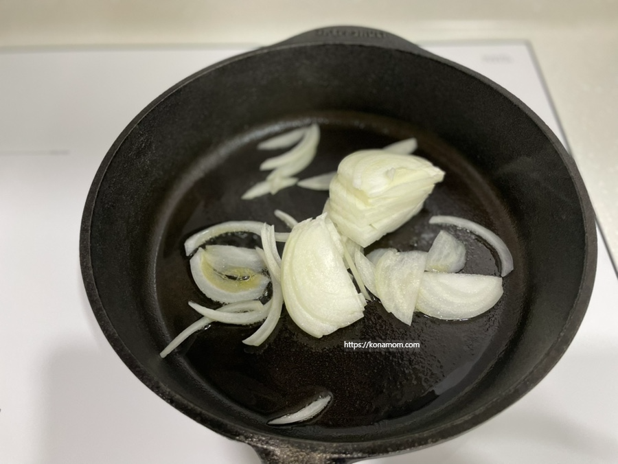 식용유 2~3스푼 넣고 채 썬 양파를 넣어서 볶아 줍니다.