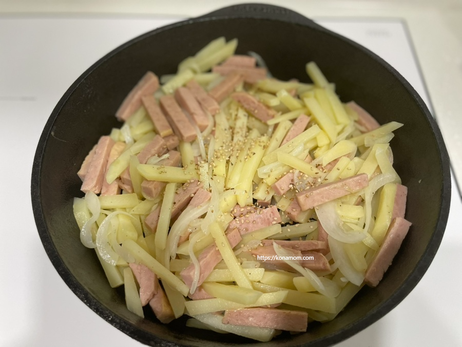 양파가 살짝 투명해지면 스팸, 감자를 넣고 소금 반티스푼, 후추 톡톡 넣어서 볶아주다가 간을 보고 간이 맞으면 (싱거우면 소금 추가)
