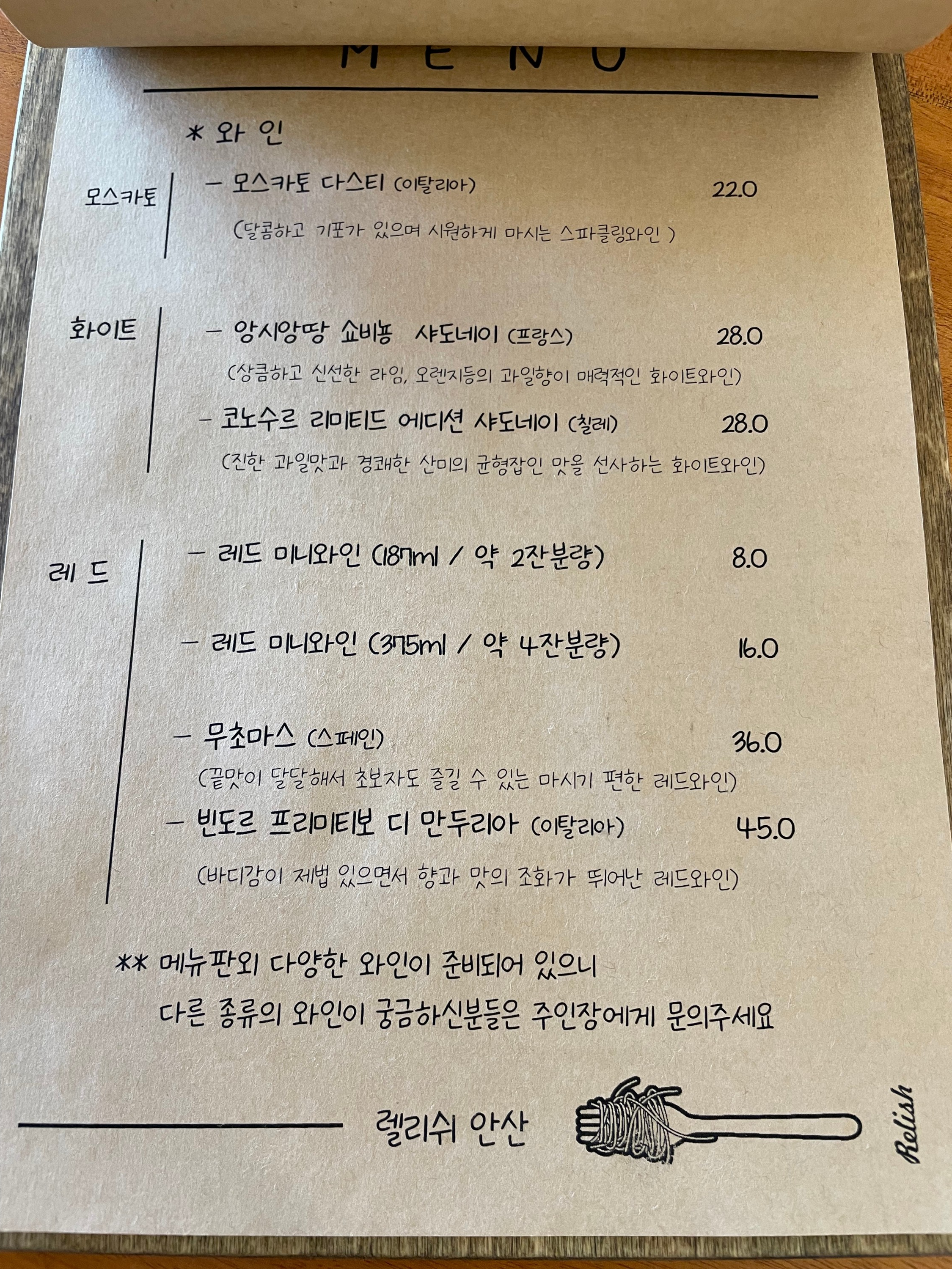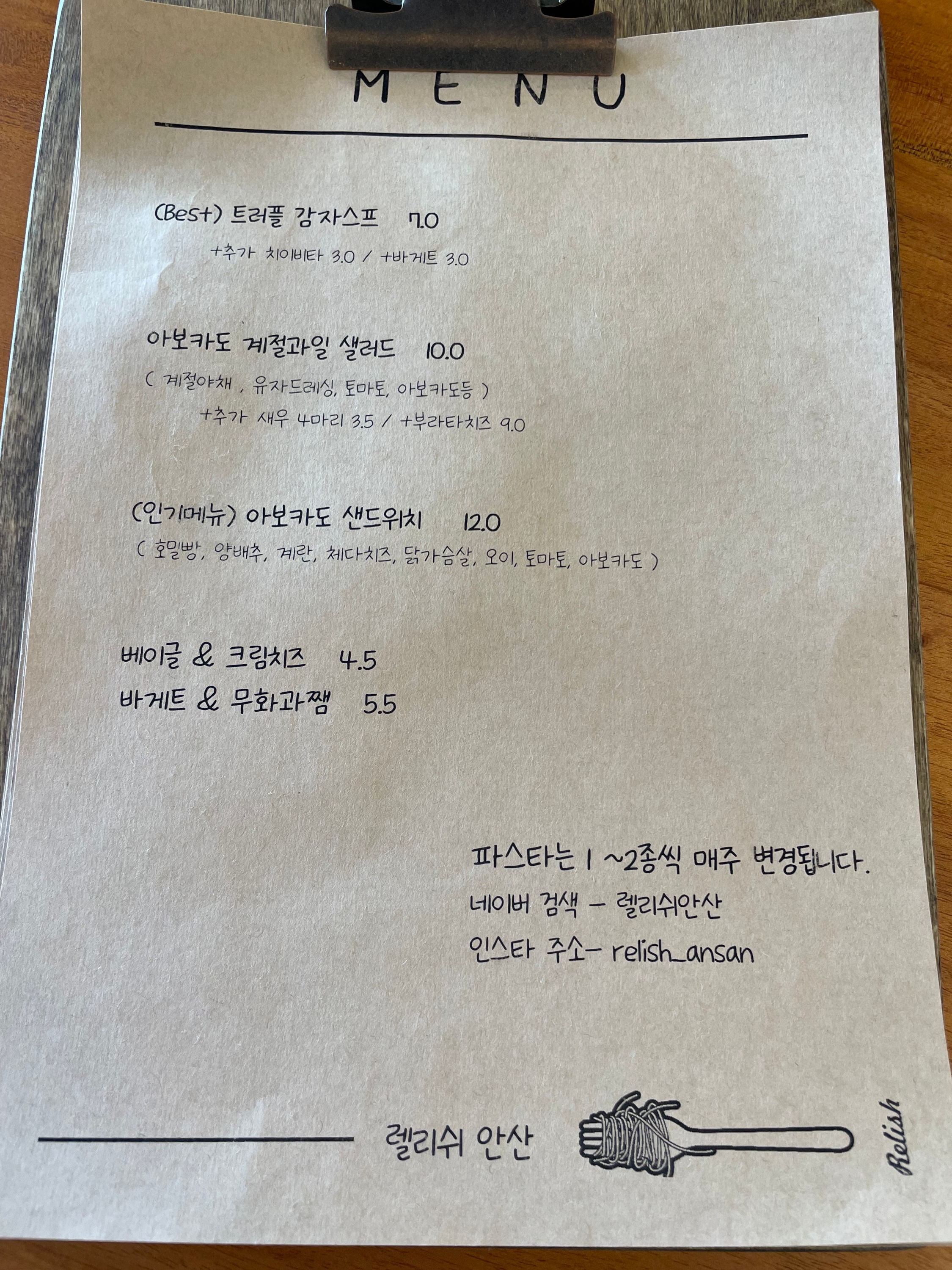 안산 월피동 맛집 렐리쉬(베르두레) 메뉴판이에요. 파스타 종류도 있고 스테이크와 음료, 주류, 와인까지!! 다양한 메뉴들을 맛보실 수 있어요.