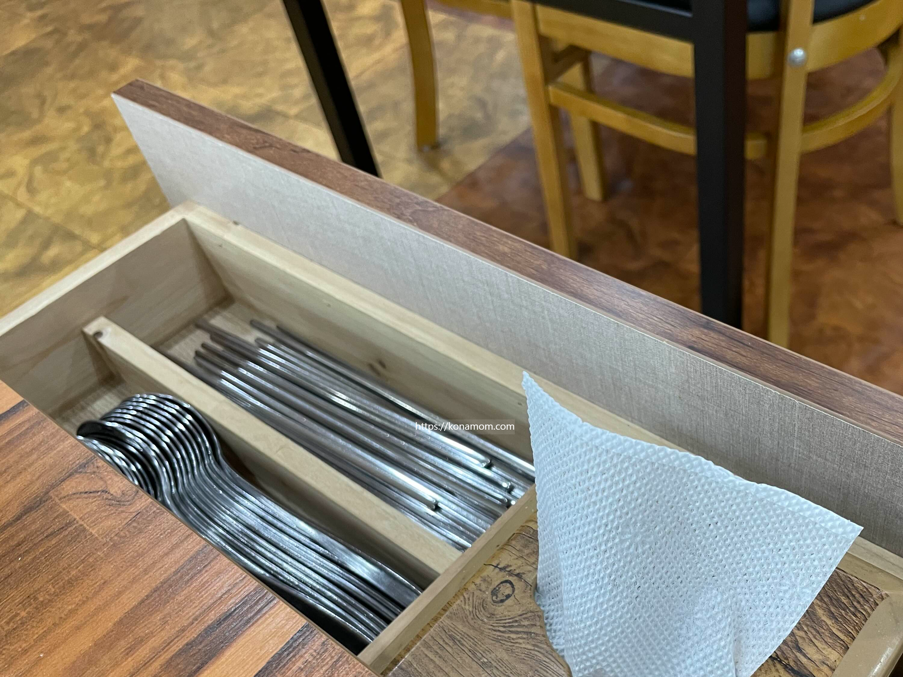들깨가루와 제피가루가 테이블 위에 있고, 수저, 냅킨은 테이블 끝 서랍에 있습니다.