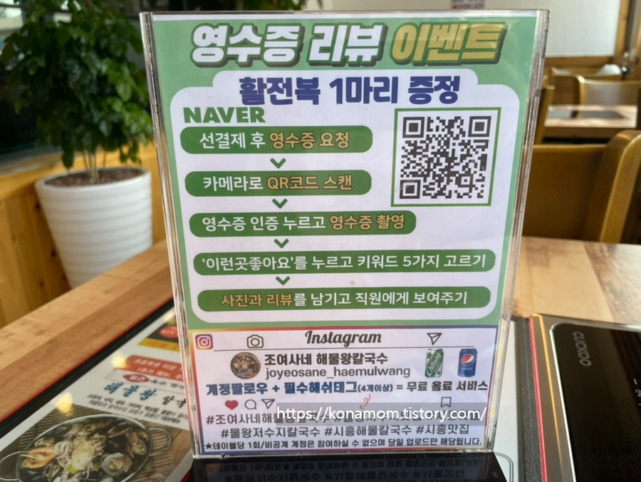 네이버 영수증 리뷰 이벤트도 진행하고 있었는데요, 선결제 후 음식 사진 찍어서 영수증 리뷰하면 활전복 1마리 주세요.