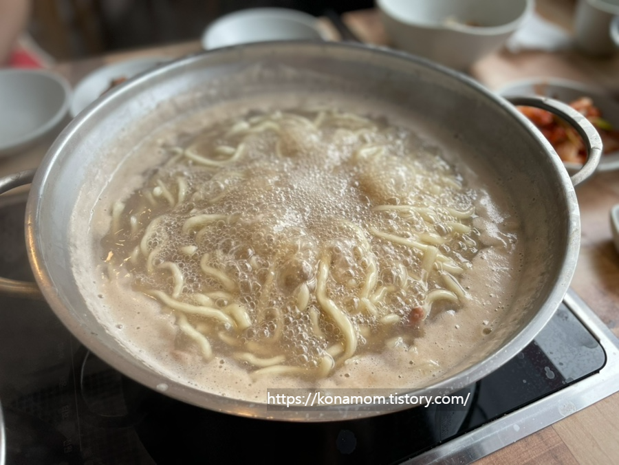해산물을 다 건져 먹고 육수 추가로 더 부어서 칼국수 면 넣고 끓여서 먹었어요.