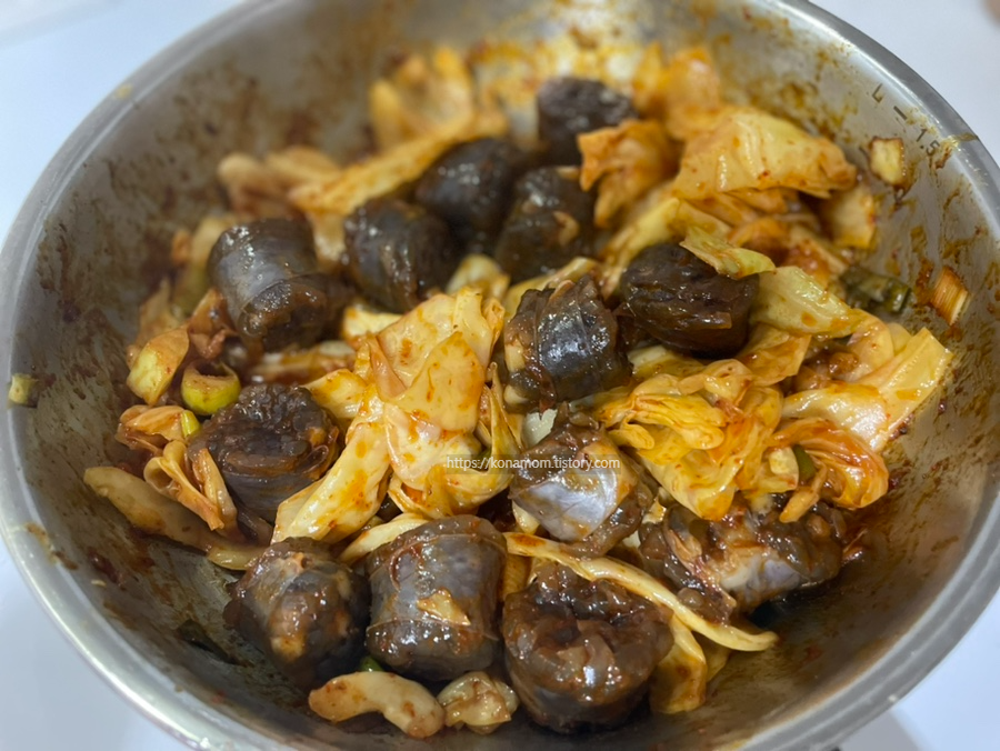 팬에 순대를 넣고 중불로 2분간 더 볶아준 뒤 양념을 넣고 중불로 1분간 더 볶아 줍니다.