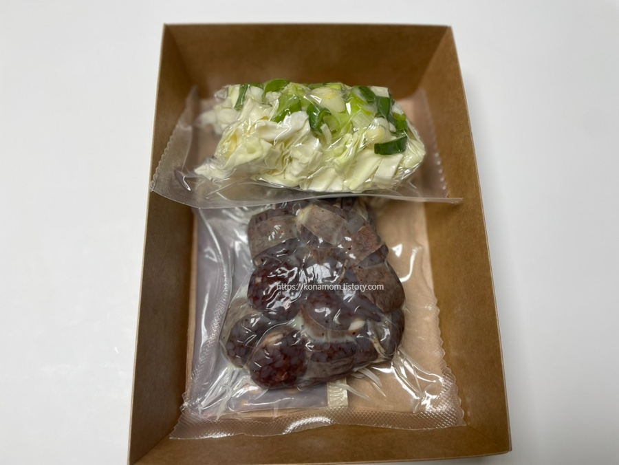 구성은 순대, 들기름, 순대볶음 양념, 야채(양배추, 대파)가 들어가 있습니다.
