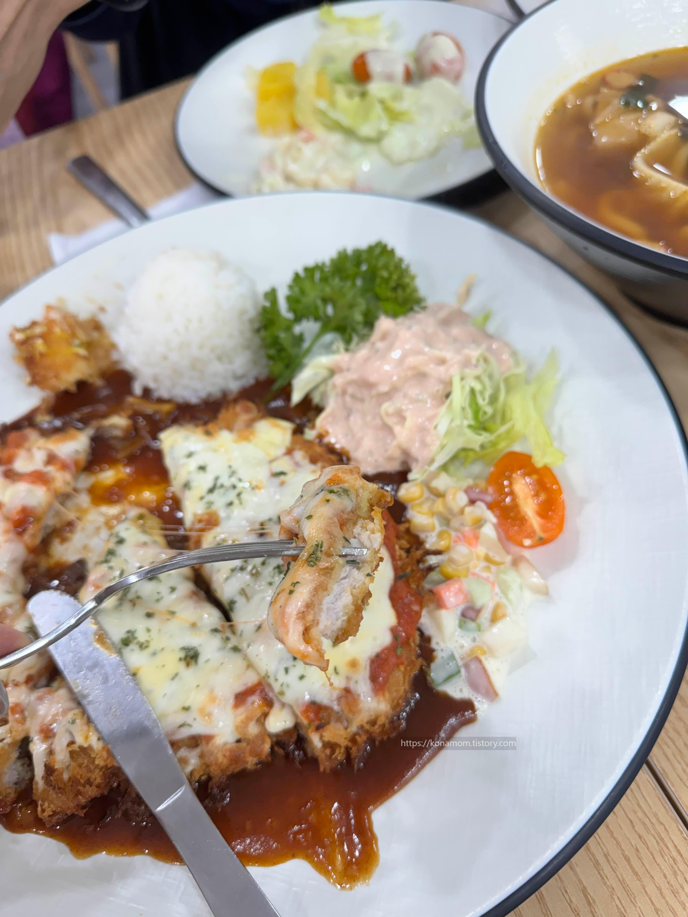 생선까스, 함박스테이크, 바삭한 수제돈까스, 큼직한 블랙타이거 새우튀김이 나오는 푸짐한 한 접시인데, 성인 1인이 드셔도 충분히 든든한 푸짐한 양이었습니다.