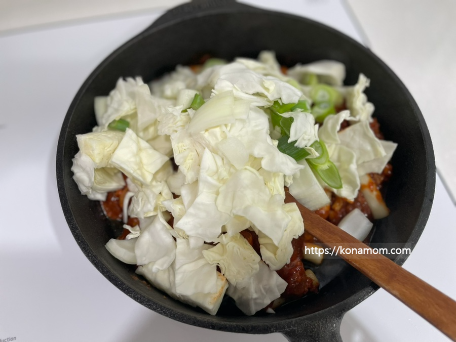 냉장고에 마침 양배추가 있어서 양배추, 양파, 대파, 청양고추도 넣고 같이 볶았더니 국물이 은근히 나와서 나중에 밥 볶아서 먹기도 좋았습니다. 스켑슐트 무쇠팬을 자주 사용하는데, 닭갈비 할 때나 볶음밥 눌어서 먹을 때나 정말 구입하길 잘 했다고 생각했습니다.