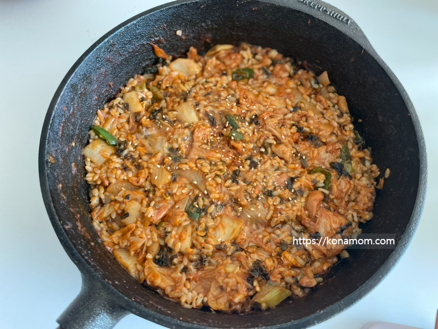 K 디저트! 볶음밥 필수! 야채와 닭갈비를 일부러 조금 남기고 밥, 대파, 김가루 넣어서 볶다가 무쇠팬이기 때문에 일부러 좀 눌어서 먹었습니다. 불 끄고 참기름에 통깨 솔솔 뿌려주면 끝입니다!