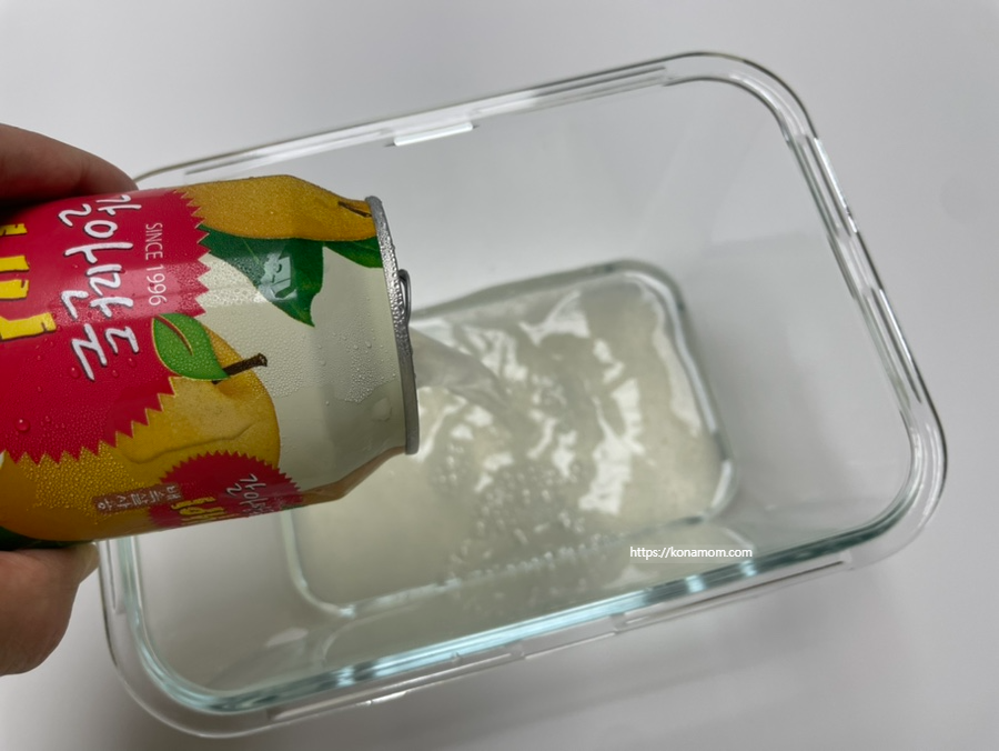 류수영 돼지불백은 초간단 양념 레시피를 소개하고 있는데요. 양념은 간장, 식초, 설탕 이렇게 세 가지를 넣는데, 여기에 한 가지 더 들어가는데 바로 갈아 만든 배! 음료입니다. 238ml 한 캔을 밀폐용기에 부어주고