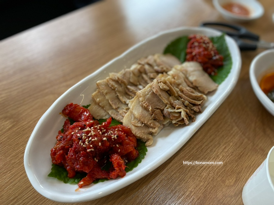 여러명이서 가서 다양한 메뉴를 주문했어요. 보쌈은 코나가 가장 좋아했어요. 얇게 썰어져 나와서 아이가 먹기 좋았습니다.