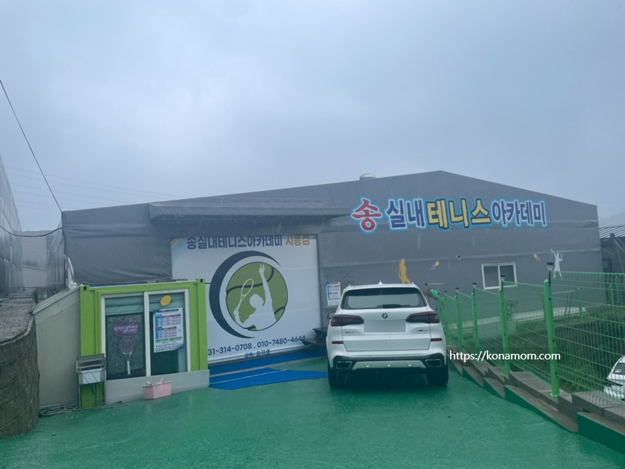 비가 정말 많이 왔어서 사진이 흐리게 나왔는데, 풋살장 바로 옆에 송실내테니스아카데미가 보입니다.