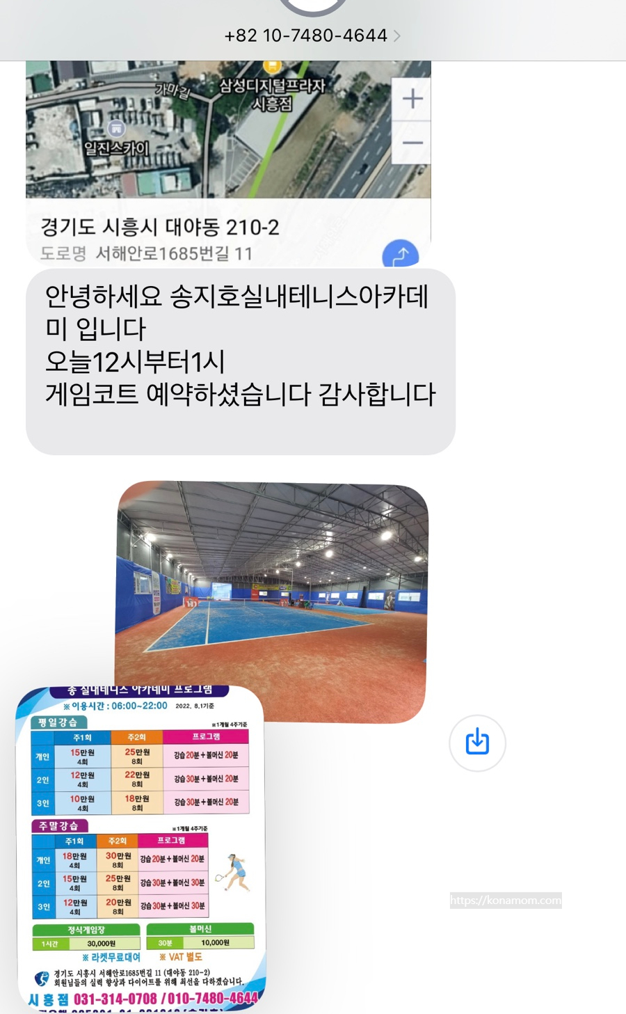 그래서 친한 언니와 실내에서 칠 수 있는 곳을 검색했는데, 시흥에 실내테니스장이 있어서 문의했는데, 당일 자리가 있어서 테니스 게임코트 대관 가능하다고 하셔서 바로 예약하고 다녀왔습니다.