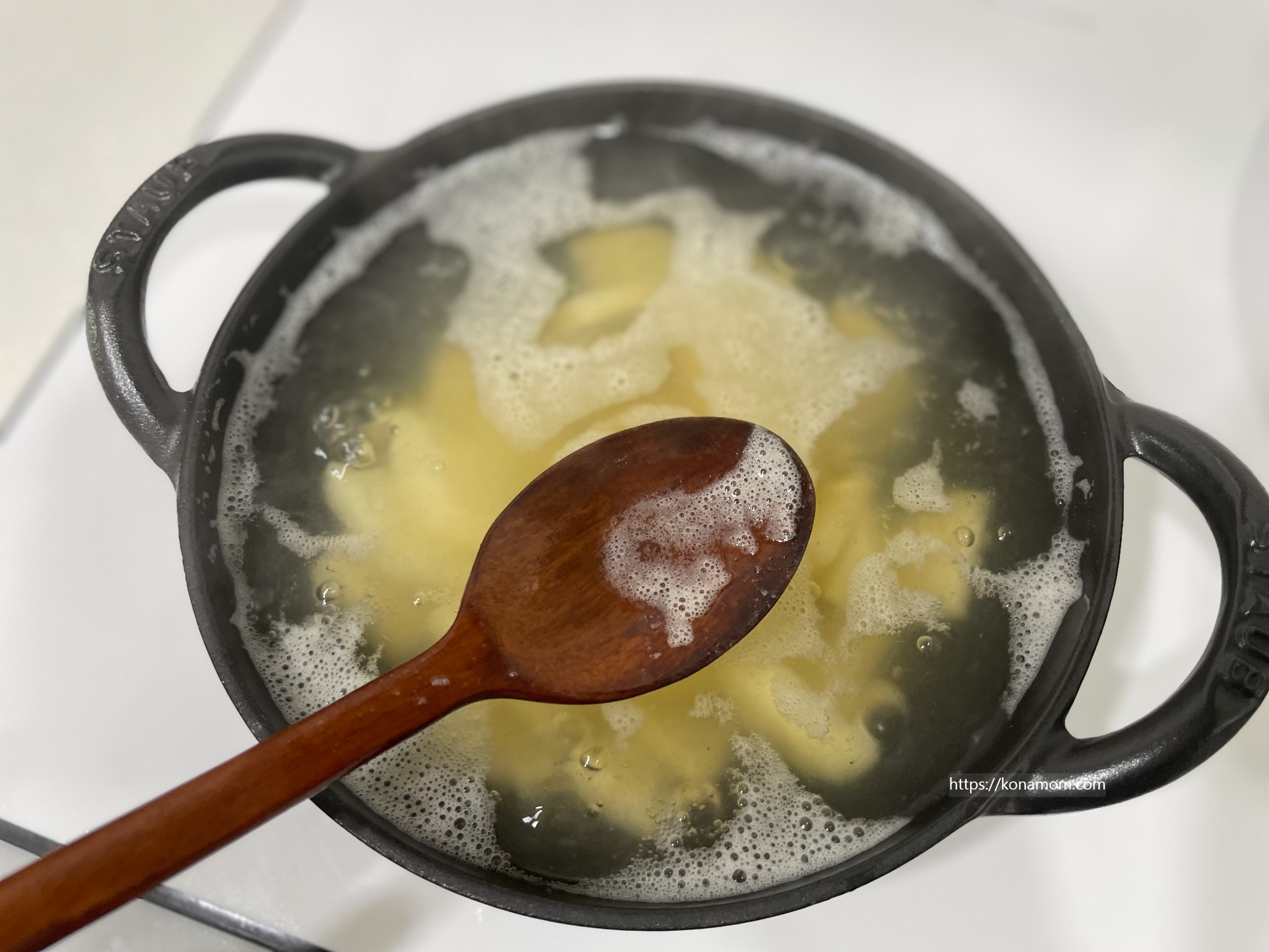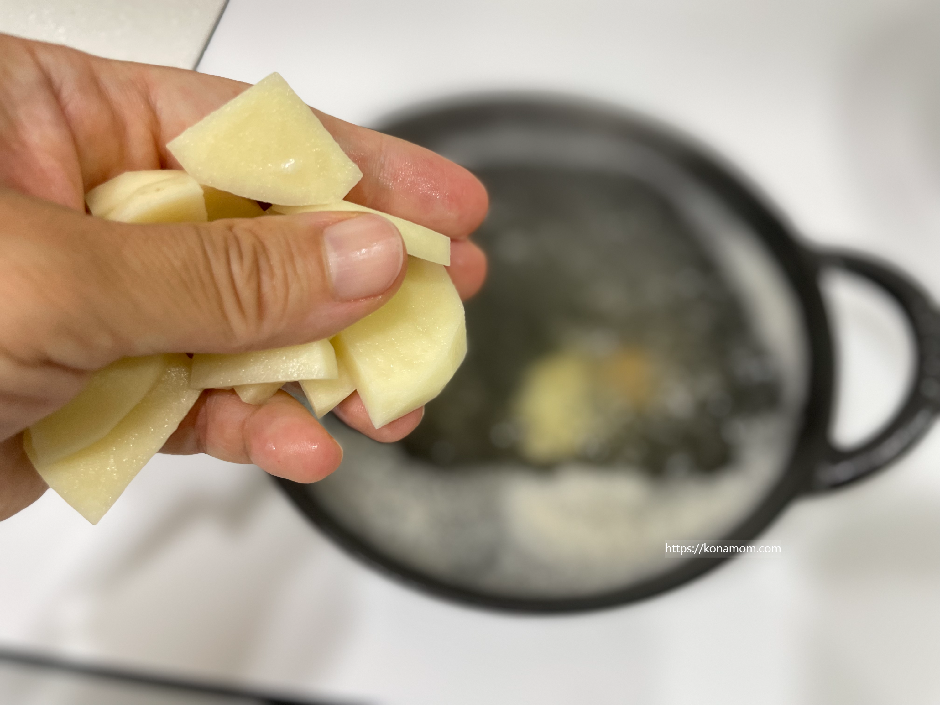 물이 끓으면 두껍지 않게 썰어둔 감자를 넣어 줍니다.