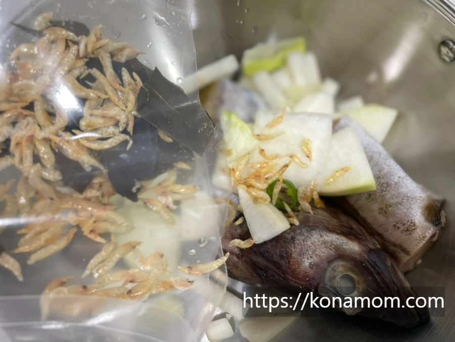 머리까지... 생선 눈 보이는 거 싫어 하지만.. 다 넣어야 맛있을 것 같아서 다 넣고 조리했어요.