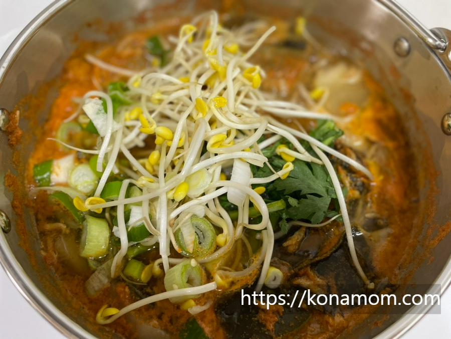 10분 후 콩나물, 쑥갓 대파를 넣어 주세요.(저는 청양고추, 다진 마늘 조금 더 넣어 줬어요.)