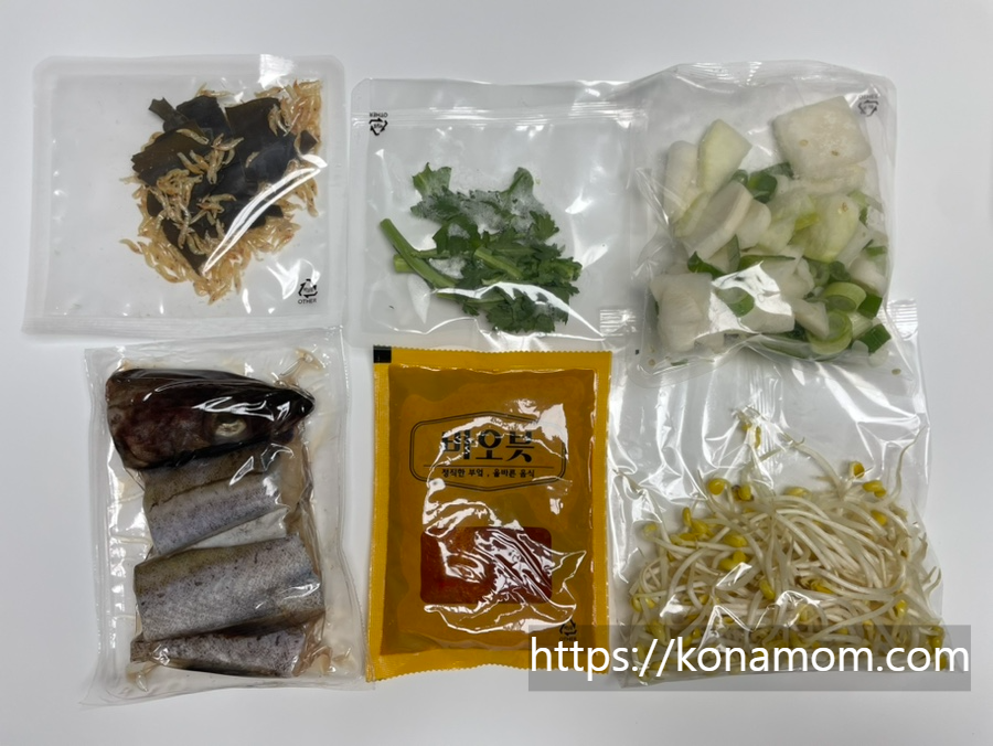 콩나물, 대파, 쑥갓까지! 정말 밀키트 너무 편하네요. 다 따로 사려면 재료 조금씩 남고 하는데, 딱 이것만 할 수 있게 나오니 좋네요. 2인 가구나 식구가 적은 가족들한테 편할 것 같아요.