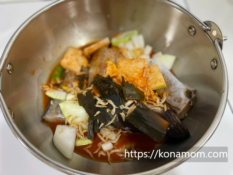 한 마리가 그대로 동태탕엔 육수를 위한 다시마+멸치, 쑥갓, 무+대파, 콩나물, 동태 한 마리, 육수가 들어가 있어요.(두부는 안 들어가 있습니다!)